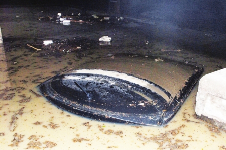 昨日凌晨1點過,還在睡夢中的張先生被窗外的雷鳴聲驚醒,接著他聽到樓下傳來喊叫,“車庫被淹了,快把外面的車開走。”張先生猛地從床上爬起來,火急火燎地跑向車庫時,發現雨下不夠半小時,車庫的積水已經漲到3米深,里面的7輛汽車全部被淹沒頂。直到昨日下午7時,車庫內的淤泥還未被清理干凈。 (記者 薛小龍 攝影 呂甲 實習生 周烜)