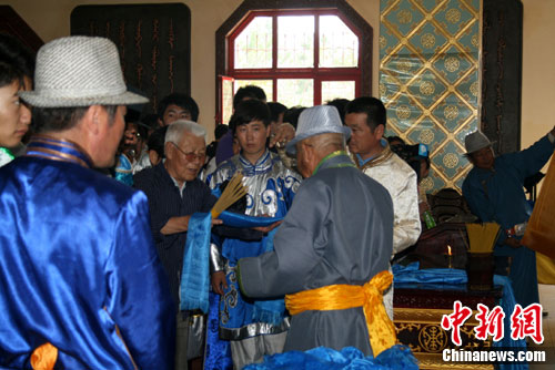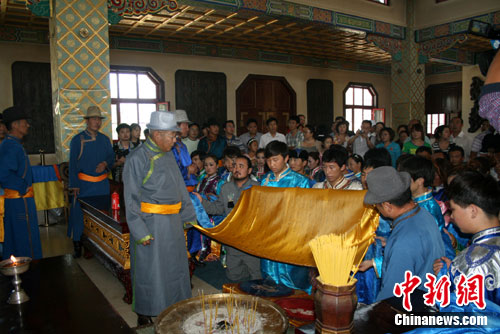 祈福儀式是在今天下午2時(shí)許開(kāi)始的。在成吉思汗陵后殿供奉成吉思汗和夫人孛爾帖靈柩的靈包中,一位達(dá)爾扈特蒙古族老人手舉著延續(xù)將近800年不滅的長(zhǎng)明燈,口誦禱文,為舟曲泥石流災(zāi)區(qū)人民祈福。