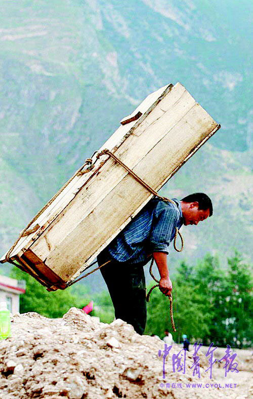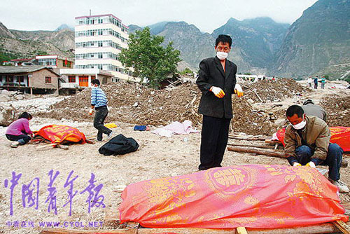 12日中午,何周林終于挖出了妻子的尸體。妻子的旁邊,5個月大的女兒熟睡著,身上的紅肚兜仍然完好無損。小生命還沒來得及細細打量眼前這個陌生的世界,就已匆匆離開。這個30多歲的男人始終一言不發,親戚們用一條黃色的條幅將遺體四周圍了起來,男人則用一口鋁盆一遍遍舀滿渾濁的河水,反復地清洗自己女人和女兒的遺體。洗畢,他一個人蹲在旁邊,出神地看著,像是要帶走什么似的。這或許是生者能留給死難的親屬最后的尊嚴。沒有人能知道,這道泥石流劃開的情感裂痕,需要多久的時間才能愈合。