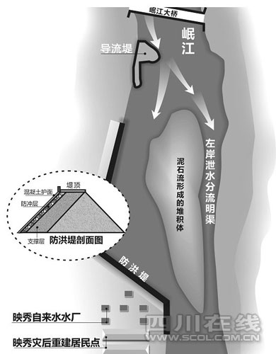導。8月16日20時至18日17時,進占右岸岸邊建導水堤,一是將岷江水向左岸引導,盡量從左岸泄流明渠過流;二是通過導水堤,為挖掘機械建立起從岷江大橋到映秀水廠的搶險道路。