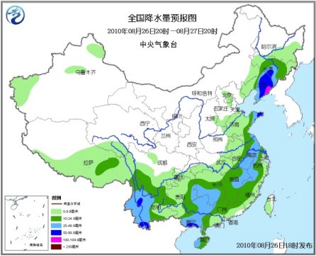 26日20時至27日20時,新疆天山局部地區和南疆西部、青海南部、西藏南部和中東部、內蒙古東南部、東北中南部、華北東部和南部、黃淮大部、江淮大部、江漢南部、江南、華南大部、西南大部等地有小到中雨或陣雨,其中,吉林南部、遼寧中東部、山東半島東部、江蘇東部和南部、安徽南部、浙江西部、江西東北部以及湖南南部、貴州東部廣西中東部、海南西部、云南中西部等地有大到暴雨,遼寧東部的局部地區有大暴雨;上述部分地區并伴有短時雷雨大風等強對流天氣。新疆北部、內蒙古東部、東北有4~6級風。南疆盆地的部分地區有揚沙或浮塵天氣。黃海北部和中部海域將有6~7級、陣風8級的旋轉風;南海中部海域將有5~6級、陣風7級的旋轉風。