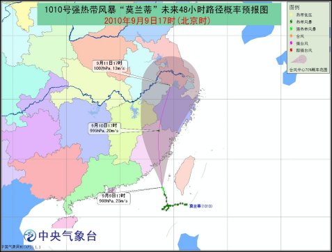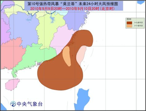 受熱帶風暴和西南季風共同影響,9月9日20時到10日20時,巴士海峽、巴林塘海峽、臺灣海峽、南海北部、臺灣西部和南部沿海、福建中南部沿海、廣東沿海將有7-8級大風,“莫蘭蒂”中心經(jīng)過的附近海面或地區(qū)的風力有9-11級,陣風可達12-13級;浙江東部沿海和南部、福建、廣東中東部和西南部、廣西南部、海南、臺灣等地有大雨或暴雨,其中,福建東南部、臺灣南部等地局部有大暴雨。
