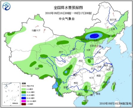 中新網9月16日電 據中央氣象臺預報,未來三天,新疆西部、青海、西藏中東部和南部、西北地區中東部、內蒙古大部、東北大部、華北、云南、四川等地有小到中雨或陣雨天氣,其中,內蒙古中部偏南地區、華北中北部、云南西部、遼寧及臺灣東部等地的部分地區有大雨,局地有暴雨,上述地區局部并伴有短時雷雨大風或冰雹等強對流天氣。