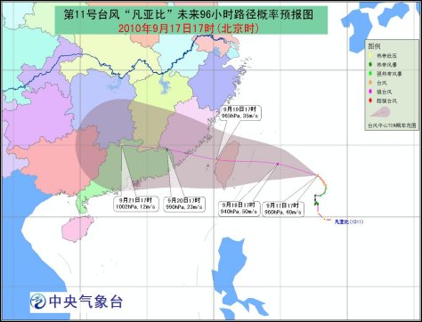 預計,“凡亞比”中心將以每小時10-15公里的速度先向西偏北方向移動,以后逐漸轉向偏西方向移動,移速將略有加快,強度繼續加強,并向我國臺灣東部一帶沿海靠近,將于19日凌晨到白天在臺灣東部沿海登陸;之后,“凡亞比”將穿越臺灣島進入臺灣海峽,向福建中部到廣東東部一帶沿海靠近。