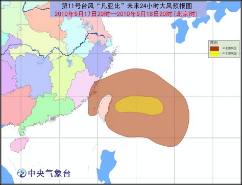 受其影響,17日20時至18日20時,臺灣以東洋面、東海南部、臺灣東部及北部沿海、福建中北部沿海、臺灣海峽將有7-9級大風,部分海域風力可達10-12級,“凡亞比”中心經過的附近海面的風力有13-16級;臺灣東部將有中到大雨,局部地區有暴雨。
