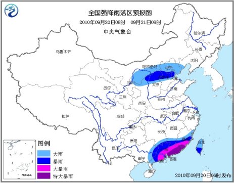 中新網9月20日電 中央氣象臺9月20日06時繼續發布暴雨藍色預警:9月20日08時到21日08時,浙江東南部、福建東部和中南部、江西南部、湖南東南部、廣東大部、廣西東部、臺灣等地將有大到暴雨,福建東南部、廣東中東部等地的部分地區有大暴雨,局地有特大暴雨。