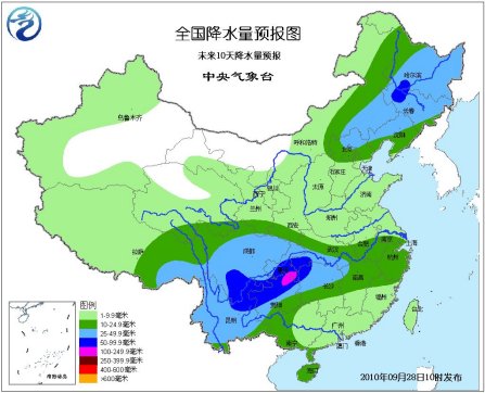 預計未來10天,西南地區東部陰雨天氣較多,降水量一般有30-70毫米,局部地區有80-120毫米;西北地區東南部、華北中部和北部、東北、江南北部、華南沿海有10-25毫米,局部有30-70毫米降水。