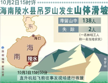 吊羅山區(qū)于2日15時發(fā)生山體滑坡事件,125名游客和13名吊羅山林業(yè)局工作人員被滯留山中。海南省和陵水縣有關(guān)部門原定于4日上午根據(jù)天氣變化情況擇機開展救援行動。