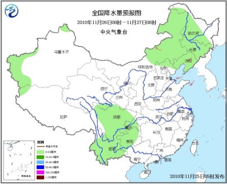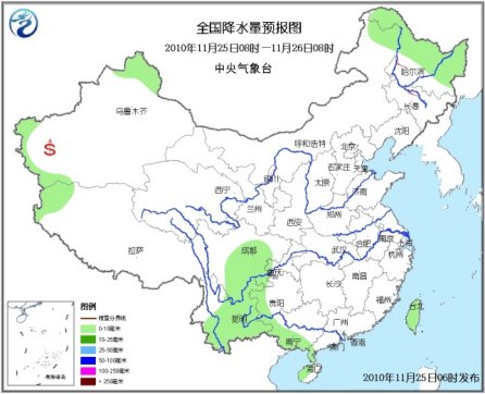 25日08時至26日08時,新疆北部和西南部局部、西藏西部、黑龍江北部和東部等地有小雪(雨)或雨夾雪;四川中南部、云南大部、貴州西部、廣西西部和南部、海南西部以及臺灣等地有小雨或陣雨。東北北部等地有4~5級偏北風,東南部沿海有5~7級風;南疆盆地西部有揚沙或浮塵天氣。。