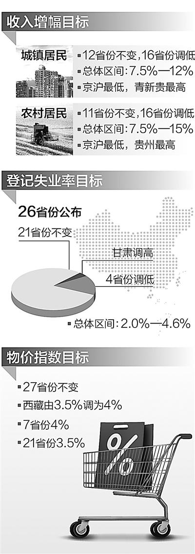 截至1月23日,除了安徽、海南、湖南,全國共有28個省份召開兩會。梳理各地政府工作報告可以發現,緊扣經濟增長目標,各地居民收入、物價指數、登記失業率等指標也作了相應調整。整體表現為:收入增幅目標調低,物價調控目標保持穩定,登記失業率目標變化不大。