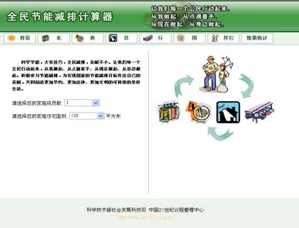 作為科技部、國家發(fā)展改革委、中宣部等六部委聯(lián)合推動的“節(jié)能減排全民科技行動”的重要內容之一,在科技部社會發(fā)展科技司、中國21世紀議程管理中心的組織下,在中科院地理科學與資源研究所的專家們在其承擔的“十一五”國家科技支撐計劃項目課題“公民節(jié)能減排潛力指標體系”研究成果的基礎上,開發(fā)完成了“全民節(jié)能減排計算器”。