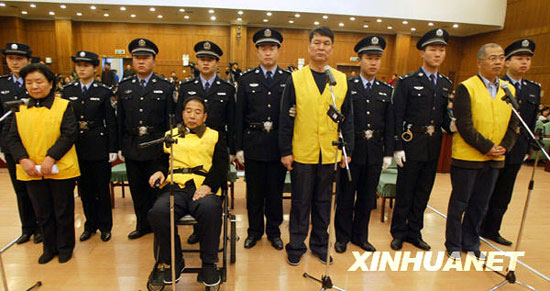 上午八時,本案開庭,能容納四百人左右的審判廳座無虛席。田文華身著印有“石市二看”字樣的黃色囚衣在兩名女法警的帶領下進入法庭,神情與往常無異。同案三人均由兩名法警帶領進入法庭,其中王玉良坐輪椅出庭。被訴單位三鹿集團,由工會主席冉偉光作為訴訟代表人出庭。