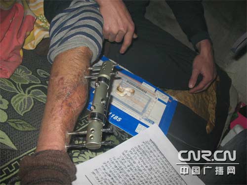 走進(jìn)李權(quán)柱租來的不足10平米的小屋時(shí),屋里彌漫著嗆人的煤煙,但屋里的水缸卻結(jié)了冰。李權(quán)柱和他的愛人蜷縮在炕頭,挽起薄薄的秋褲,記者看到,一個(gè)60公分長(zhǎng)的鐵夾深深地嵌進(jìn)李權(quán)柱的小小腿上,皮膚和鐵夾相連的地方還在往外流著膿水,李權(quán)柱就拿紙纏在鐵夾上。