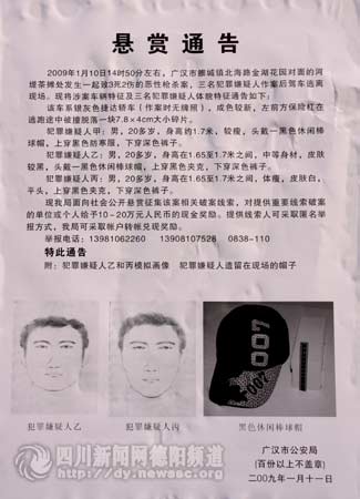 13日上午,記者在廣漢各大街道、小區看到,廣漢市公安局貼出了懸賞通告,向社會公開懸賞征集廣漢市“1.10”惡性槍殺案相關破案線索,對提供重要線索的單位或者個人,將給予10-20萬人民幣現金獎勵。提供線索人可以匿名舉報方式。舉報電話:13981062260、13908107528、0838-110(記者 李安國)