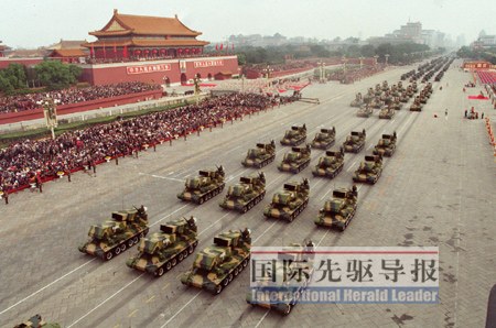 金水橋5個橋面的加固修繕1個月前就已展開。人們期待著10月1日那天,中央軍委主席胡錦濤或?qū)⒋┻^這里步入敞篷閱兵車,沿著長安街由西往東檢閱三軍部隊。十年前的閱兵,他也是一位重要的見證者。在一張新華社記者當(dāng)時拍攝的照片上,作為中央政治局常委之一,胡錦濤站在天安門城樓上,和其他常委一起向廣場上的人群揮手致意。