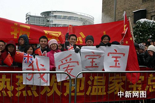 中新網倫敦2月2日電(記者 張朔)當地時間二月二日下午,即將結束訪英和訪歐行程的中國總理溫家寶踏雪到訪劍橋大學,受到學子們的熱烈歡迎。有的學生甚至還打出了中文標語:“我愛寶寶。”