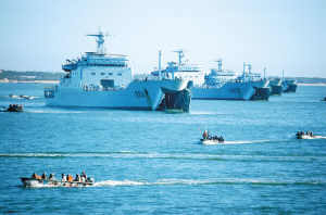 “按新大綱施訓,聯合是個重頭戲。但是,以往高層指揮機構聯訓較多,基層部隊聯訓不夠。這種做法,容易造成聯合訓練‘有想法沒辦法’,使得基層部隊聯訓就像捆籬笆,拴在一起也是貌合神離,經不起風雨。今年按綱施訓,我們力求解決這個問題,大力提高一線指戰員的聯合素質。”王支隊長話音剛落,只見熒屏上出現精彩一幕:登陸艦抵達泛水點,帆纜業務長、四級士官羅曉春組織帆纜兵開大門、展吊橋,指揮兩棲坦克泛水;當登陸兵突擊登陸時,遭到“敵”灘頭火力猛烈阻擊,“海洋山”艦艦長鄧先武果斷命令艦炮進行火力支援,發發炮彈將“敵”地堡掀上半空……