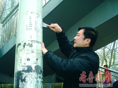 上午9時(shí),在兒童醫(yī)院東側(cè)路段,槐蔭區(qū)區(qū)長(zhǎng)楊峰,手里拿著一個(gè)噴壺和一把小鏟子,清理野廣告。看到一家電信營(yíng)業(yè)廳前的電線桿上貼滿(mǎn)野廣告,他過(guò)去先是用噴壺噴水,把紙弄濕,然后再用小鏟子快速鏟除。由于桿子上端也有臟兮兮的廣告,他踩上旁邊的一個(gè)鐵柵欄,伸長(zhǎng)手臂,費(fèi)力鏟凈。不多會(huì),桿子上的野廣告就消失殆盡,接下來(lái),他又用抹布把桿子擦干凈。