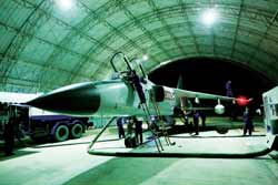 “1號請求起飛。”“按計劃執行。”一切準備就緒后,塔臺指揮員干凈利索地下達了命令。18時25分,該團團長李軍第一個駕駛“飛豹”戰機沖向跑道。頓時,機場上響起巨大轟鳴聲,震得記者耳朵嗡嗡作響。滑行,加力,起飛,戰鷹閃著亮光騰空而起,噴著橘紅色的尾焰直沖蒼穹,最后消失在茫茫夜色之中。