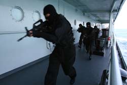 頓時,空中戰機盤旋,艦上炮火轟鳴。“噠噠噠……”空中直升機上擔負火力支援任務的狙擊手將在前甲板觀望的2名“恐怖分子”擊斃。在“恐怖分子”驚慌之際,突擊隊員以迅雷不及掩耳之勢,瞬間從空中、海上登臨貨輪,迅速突入艙室,進行搜尋圍殲。不久,突擊隊員報告:我已控制全船,經嚴密搜尋和查點,未發現其他可疑爆炸物……