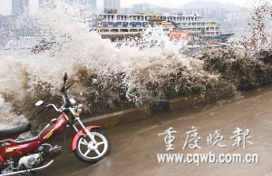 昨下午2時,朝天門六碼頭,岸邊玩耍的市民突然遭遇兩米多高的巨浪襲擊。因躲閃不及,好幾位市民濕身。正在浮船上作業的水手也隨浮船被巨浪抬起半米多高,浮船險些失控。