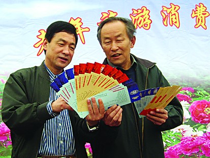 3月21日,菏澤市老齡辦、市旅游局和菏澤康輝旅行社聯手向菏澤市55歲至70歲的老人首次發放價值140萬元的旅游消費券,可惠及菏澤市2萬名老人。本次老年旅游消費券分為20元與50元面值,菏澤市計劃發放2萬套,價值140萬元。