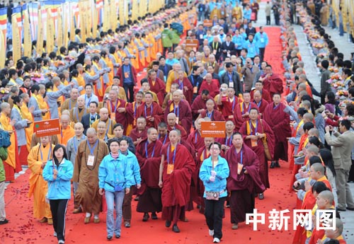 中新網無錫三月二十八日電(記者 陳光明 朱曉穎)第二屆世界佛教論壇今日上午八點半在江蘇無錫市盛大開幕。來自五十多個國家和地區的一千二百余佛教界高僧大德及專家學者匯聚無錫靈山,與會的高僧大德和文化學者將共同探討佛教在面對國際沖突、環境惡化、經濟變化時的社會責任和作為。