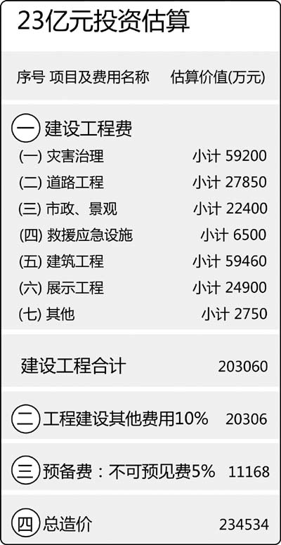 “主題為‘永恒北川’的北川國家地震遺址博物館整體設(shè)計方案已經(jīng)有關(guān)部門原則性通過,初步預(yù)算總投資為23.45億元,資金一經(jīng)劃撥,將即時開建!