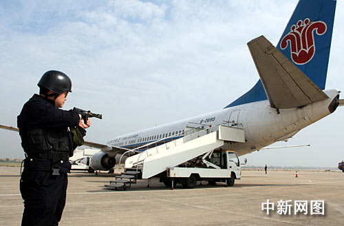 中新網武漢4月28日電 (林樺 陳曉東 田劍清 徐金波)一場驚心動魄的反劫機應急救援綜合演練,28日在武漢天河機場跑道北邊的東航停機坪上演。