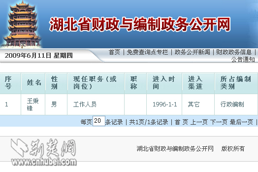 湖北省財(cái)政與編制政務(wù)公開(kāi)網(wǎng)工作人員告訴記者,湖北省推行的是“陽(yáng)光編制”,只要發(fā)生人事變更,該網(wǎng)便會(huì)在第一時(shí)間更新數(shù)據(jù)。11日上午10時(shí),記者發(fā)稿前,王秉鋒的姓名仍掛在湖北省財(cái)政與編制政務(wù)公開(kāi)網(wǎng)上,所屬單位為紅安縣國(guó)土資源局。(記者張揚(yáng))