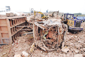 廠區(qū)四周的圍墻已經(jīng)多處出現(xiàn)了爆破后的破損,廠子的西圍墻部位,被掀翻后的辦公樓的混凝土砸出了近20米的缺口,破損的石塊下,不時還可以看到被撕破的衣服和鞋子等物。工廠大門口,一輛轎車被沖擊波完全擊碎,連什么品牌都無法辨認(rèn)。