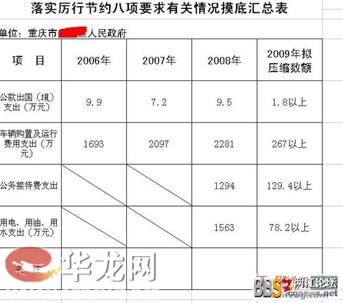 網友曝出的這份某區“落實厲行節約八項要求有關情況摸底匯總表”顯示,2006年,重慶某區政府在公車購置及運行費用一項上花掉了1693萬元,此后兩年開銷不見回落,至2008年已高達2281萬元。今年,政府厲行節約八項要求,“勒緊公款腰包”,公車一項亦擬花2000萬左右。除此之外,該區政府去年于公款出國(境)支出9.5萬元,公務接待用了1294萬元,用電、用水、用油花了1563萬。如此巨額公費開支,令人震驚。