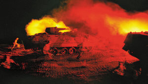 “新大綱規定,夜訓按照年度訓練總時間20%的比例安排。今年,我們著力提高夜間單兵專業技能的生成和轉化。”盛團長話音剛落,伴著隆隆的炮擊聲,夜暗深處火光頻閃。原來,該師新型教練員、二營教導員杜文斌正在組織官兵進行坦克夜間教練射擊課目訓練。眼前景象大出記者意料:目標顯示不再是一盞孤燈,而是以打信號彈、模擬射擊火光和車輛閃爍明滅的燈光等多種方式,大大增加了射擊難度。“敵人射擊炮口一閃,你能不能馬上回敬一炮?我們練的就是這個!”杜文斌自豪地說。