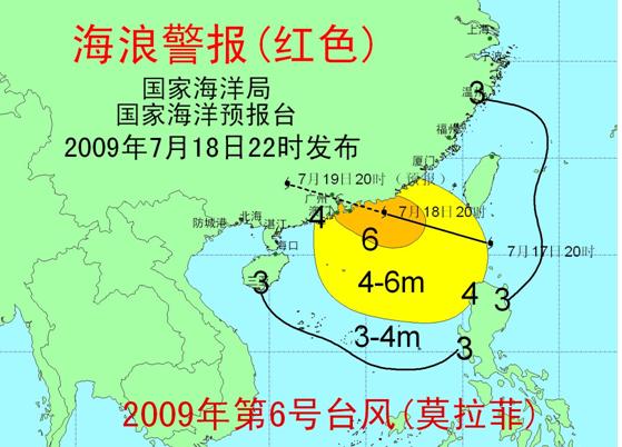 海洋預報臺稱,受今年第6號臺風“莫拉菲”的影響,預計18日夜間到19日上午南海北部將出現6到8米的狂浪區,臺灣海峽南部將出現4米的巨浪區;廣東省東部沿海將出現4到6米的巨浪到狂浪,福建省南部沿海將出現2.5到3米的大浪,廣東省西部沿海將出現3到4米的大浪到巨浪,請沿海各有關單位及時采取防浪避浪措施,并關注我臺后續海浪預警報。