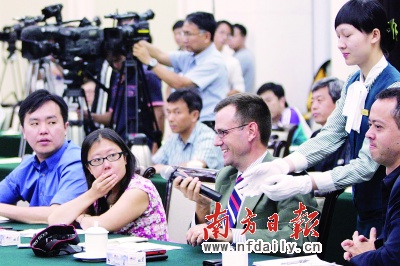 昨日下午3時(shí),廣州珠島賓館紅棉廳,來(lái)自美、英、法、德、日、韓、新加坡、香港等8個(gè)國(guó)家和地區(qū)20家境外主流媒體41名記者把長(zhǎng)槍短炮架了起來(lái)。他們此次到廣東采訪,有一個(gè)共同的“條件”:“要見(jiàn)廣東省委書(shū)記汪洋”。