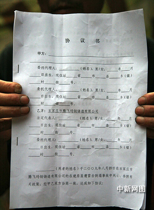 該家屬向記者出示了一份空白的“救助”協議書,協議書上的乙方為石家莊騰飛瑪鋼鑄造有限公司。該死者家屬說,今天上午10點多,有村委會干部和鄉鎮干部找到他,要求他簽署這份協議書。