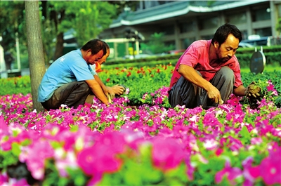 昨天,在交通部對面的綠化帶里,20多位園林綠化工人正在修剪枝椏,空地上擺滿了小花盤,紅黃綠紫,顏色多樣,引來眾多市民觀看。市園林綠化局透露,根據(jù)國慶60周年北京花卉景觀布置規(guī)劃,全市將布置各類花卉共達4000萬盆。其中,天安門廣場將在十一期間設(shè)置一組中心花壇,長安街沿線步道將布置22處立體花壇,面積達十萬余平米。其中,天安門廣場中心花壇作為主花壇,現(xiàn)暫定將安排在天安門中心廣場偏南10米的位置,呈圓形,突出“普天同慶”的主題。花壇直徑將達40米,中心主花籃高達13米,將選用真假花卉結(jié)合的方式,主選花種有粉矮牽牛花、小黃菊等。市園林綠化局負責(zé)人表示,主花壇的設(shè)計和布置還未最終確定,將在國慶游行排練之后,按實際需要做相應(yīng)的修改和調(diào)整。