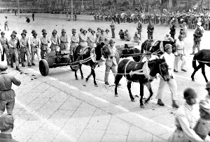 緊跟海軍方隊(duì)的,是由8000多人組成的12個(gè)步兵方隊(duì)。除了3個(gè)建制步兵團(tuán),步兵方隊(duì)還包括臨時(shí)編組的沖鋒槍、輕機(jī)槍、通信、重機(jī)槍、輕迫擊炮、重迫擊炮、戰(zhàn)防炮、山炮各1個(gè)營(yíng)。