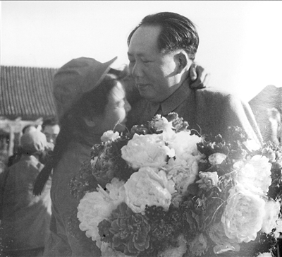 這位女文工團員給毛澤東獻上鮮花、握手后,突然撲到毛澤東懷里,緊緊擁抱著,情不自禁地淚流滿面。那一刻,在場的所有人全愣住了。被打動的毛澤東閉上眼睛,旁邊的呂厚民立即反應過來,按動快門,把這一感人的場面拍了下來。