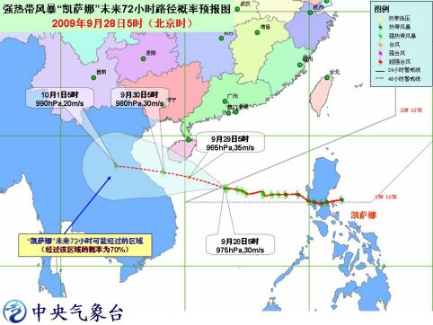 “凱薩娜”的中心28日5時位于海南省三亞市東南方約470公里的南海中部海面上,就是北緯16.1度、東經(jīng)113.3度,中心附近最大風(fēng)力有11級(30米/秒),中心最低氣壓為975百帕。