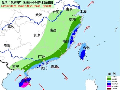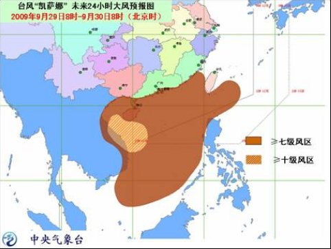 受“凱薩娜”及其外圍云系的影響,29日白天到夜間,南海大部海面、北部灣海面、瓊州海峽、海南沿海、廣西沿海將有7~9級大風,“凱薩娜”中心經過的附近海面或地區的風力將有10~13級大風,陣風可達14~16級;巴士海峽、巴林塘海峽、臺灣海峽、臺灣以東海面、廣東沿海、福建中南部沿海也將有6~7級大風,陣風可達8~9級;浙江東南部、福建東部、臺灣、廣東南部、海南等地有大雨或暴雨,海南南部的局部地區有大暴雨或特大暴雨。