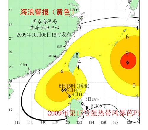受今年第17號強熱帶風暴“芭瑪”影響,預計今天夜間到明天白天:福建沿海和浙江南部沿海仍有2.8米到3.9米的大浪;臺灣海峽仍有4.0米到6.0米的巨到狂浪;東海南部仍有3.0米到4.5米的大到巨浪;東海北部將出現2.5米到3.5米的大浪;東海東部將出現3.5米到5.5米的大到巨狼。