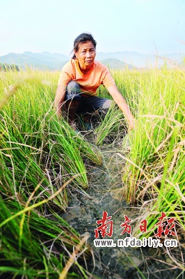 日前,韶關(guān)市仁化縣一種植戶看著自家的水稻田欲哭無(wú)淚,她家種植的9畝水稻因?yàn)榍锖祷臼铡?jù)省防總介紹,入秋以來(lái),廣東旱情繼續(xù)蔓延,旱情相對(duì)集中的地區(qū)主要有韶關(guān)的翁源、曲江、仁化,汕頭的南澳、潮陽(yáng)等地。目前逾5萬(wàn)群眾飲用水受影響,逾80萬(wàn)畝農(nóng)作物受旱,其中重旱10.59萬(wàn)畝、干枯1.16萬(wàn)畝。(新華社)