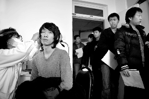 體檢內(nèi)容包括內(nèi)外科中的眼、耳、聽力、身高、體重、心電圖、血尿,以及心理、毒品、艾滋病等多項(xiàng)檢查,在視力檢查室,等待檢查的應(yīng)屆學(xué)生已排起了長(zhǎng)隊(duì),主檢醫(yī)生對(duì)應(yīng)征青年視力的各項(xiàng)指標(biāo)進(jìn)行了檢查,包括近視、斜視、色盲等內(nèi)容。主檢醫(yī)生告訴記者,每年因視力不合格的占應(yīng)征者的30%左右。