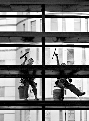 在第一家保潔公司,他認識了“高空作業”:一根繩、一個桶,主要是和廣告牌打交道。沒有“蜘蛛人”這么時髦的叫法,那時都叫爬墻工。