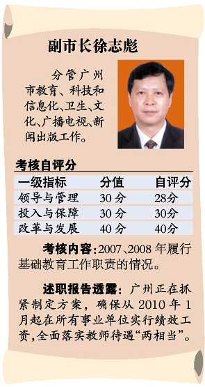 徐志彪在自評分說明中,給自己這兩年的工作成績都打了98分,并在述職報告中表示,廣州正在抓緊制定方案,確保從2010年1月起在所有事業單位實行績效工資,全面落實教師待遇“兩相當”。