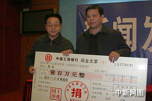中新網(wǎng)鶴崗11月22日電 (記者 吳兆飛)中華全國(guó)總工會(huì)22日向鶴崗礦難遇難礦工家屬捐贈(zèng)100萬(wàn)元,中華全國(guó)總工會(huì)副主席、書(shū)記處書(shū)記張鳴起在捐贈(zèng)儀式上還呼吁重視生產(chǎn)安全。此外,黑龍江和鶴崗的工會(huì)部門(mén)也同時(shí)分別捐贈(zèng)了50萬(wàn)元和10萬(wàn)元。