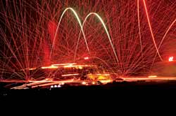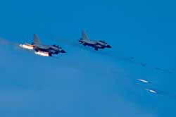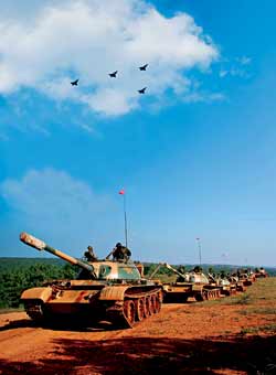 記者在演習(xí)現(xiàn)場看到,在某高地的爭奪戰(zhàn)中,紅藍(lán)雙方拼得異常激烈。拂曉剛過,“藍(lán)軍”15架飛機(jī)從多個方向同時出現(xiàn)在“紅軍”空域,準(zhǔn)備對“紅軍”目標(biāo)同時發(fā)起攻擊。“紅軍”毫不示弱,偵察飛機(jī)主動出擊,出其不意地對敵情報預(yù)警系統(tǒng)實(shí)施欺騙性干擾,與此同時,“紅軍”空中攔截兵力強(qiáng)行突防飛抵目標(biāo)上空,朝敵機(jī)猛撲過去,為奪取局部制空權(quán),與敵機(jī)展開了一場生死大戰(zhàn)。瞬間,方圓數(shù)百公里的戰(zhàn)場陡然升溫。爾后,“紅軍”空中轟炸機(jī)群多批次、多架次、不間斷對敵縱深目標(biāo)進(jìn)行持續(xù)轟炸,使敵指揮機(jī)構(gòu)、通信樞紐等重要目標(biāo)遭到癱瘓性打擊。