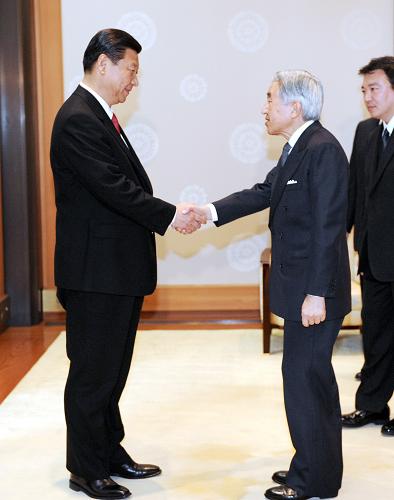 習近平向明仁天皇轉達了胡錦濤主席的誠摯問候和良好祝愿。他說,胡錦濤主席去年五月對日本進行了成功的國事訪問,全面推進了中日關系。陛下一直關心中日關系。一九九二年中日邦交正常化二十周年之際,天皇和皇后陛下首次訪問中國,給中國人民留下美好印象,在中日友好交往史上寫下重要一頁。去年中國四川汶川發生特大地震后,陛下致電慰問,日本政府和各界人士給予寶貴支援,體現了陛下和日本人民對中國人民的友好情誼。
