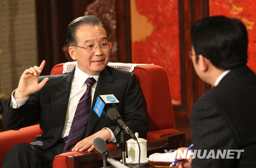[溫家寶]今天接受新華社的采訪,感到非常高興。這次采訪主要是談過去一年我們國家如何應對國際金融危機的。作為政府總理,應該把真實情況向人民講清楚,這是我的義務。同時應該給人民帶來信心和希望。